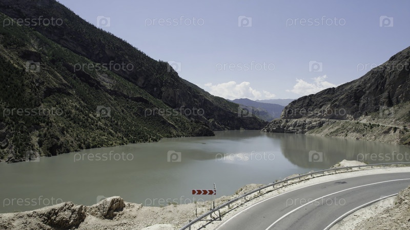 Прекрасный летний вид с высоты птичьего полета.Действие.Красивый вид на огромные зеленые горы напротив моря, рядом с которыми есть дорога для автомобилей и синее небо