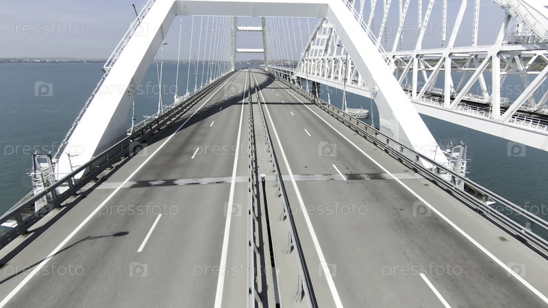 Огромный мост - это вид с высоты птичьего полета. Действие. Длинный новый мост, построенный для движения транспорта через большое море