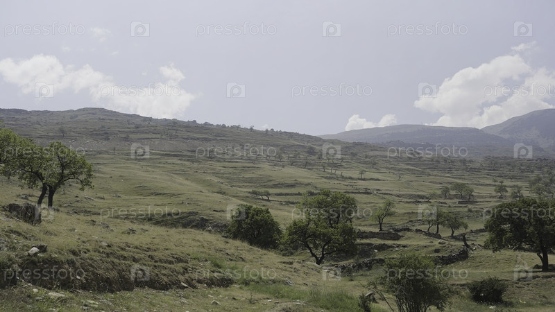 Панорама долины с редкими деревьями и холмами. Действие. Травянистые холмы с деревьями в солнечный летний день. Красивый пейзаж на холмах с редкими деревьями