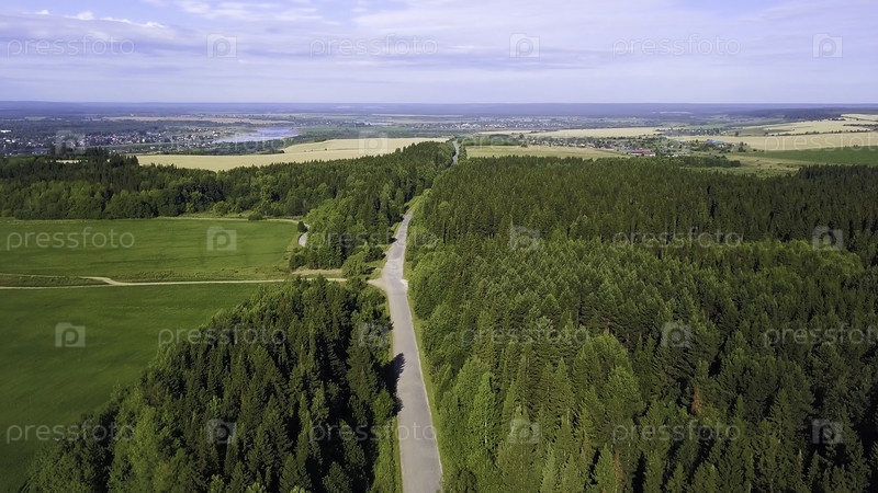 Вид с вертолета.Креативное.Летний зеленый лес, дорога, небольшой кусочек города виден сзади, голубое небо и река и маленькие поля