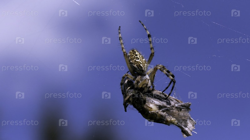 Большой паук с тонкими ногами.Креативный.Насекомое в макрофотографии сортирует большое сухое насекомое на своей паутине в голубом небе