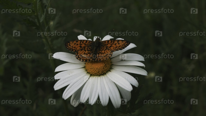 Красивая бабочка сидит на ромашке. Творческая. Яркая пятнистая бабочка сидит на цвете. Прекрасная большая бабочка сидит на ромаше. Красота макрокосмоса летнего луга