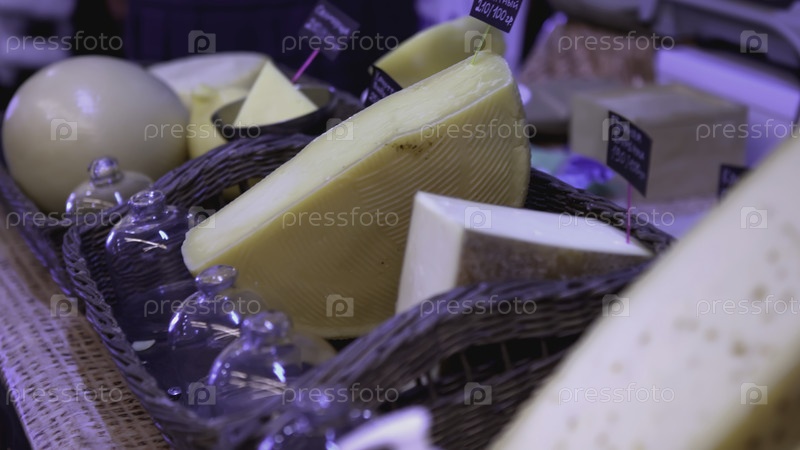 На прилавке на ярмарке есть разнообразный сыр. АРТ. Продажа домашнего сыра, лежащего в корзинах на ярмарке. Коллекция сыров крупным планом