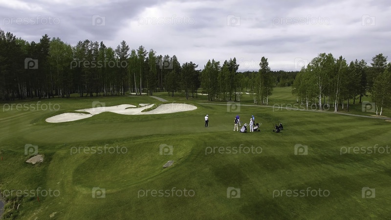 Игроки в гольф бьют голф-шот с клюшкой на курсе во время летних каникул, воздух