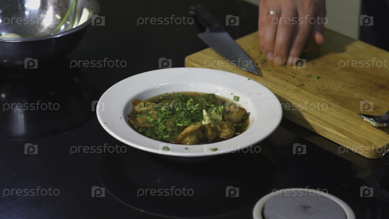 Повар подает пельмени на белой тарелке.СТРАНИЦА. Руки повара в ближайшем плане добавляют масло и зеленый лук к блюду