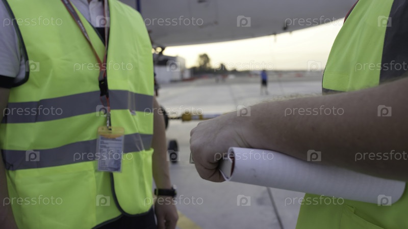 Работники в жёлтом пиджаке пожали друг другу руки. Рабочие аэропорта - рукопожатия. Инженеры - рукопожатие после проверки. Работники аэропорта
