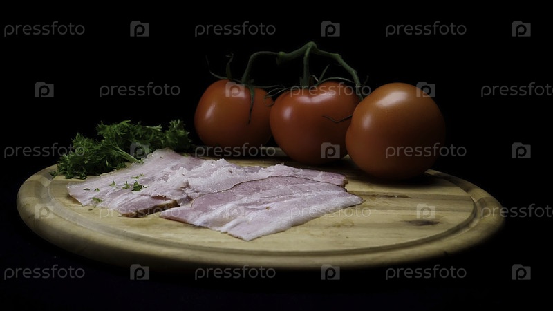 Ближе к зеленому петрушку, падающему на деревянную доску с свежими ломтиками прошутто, спелыми помидорами и зелени, изолированной на черном фоне. рама. вкусный закуска, овощи, мясо и пряности