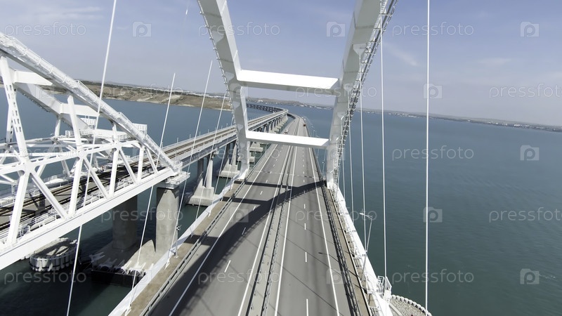 Огромный мост. Вид с дронов. Действие. Длинный мост над океаном, на котором автомобили могут свободно передвигаться, мост расположен рядом с зелеными горами