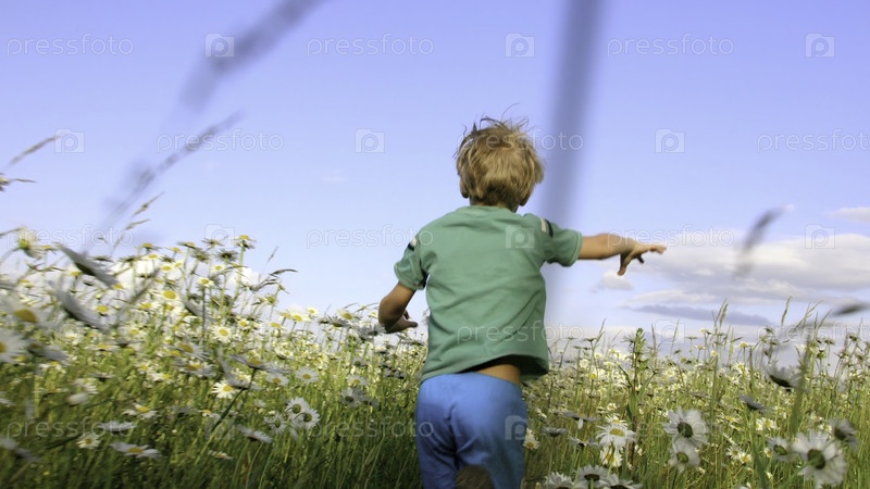 Маленький мальчик, бегущий по поле ромашки является творческим. ребенок с светлыми волосами в яркой летней одежде прыгает через поля с маленькими летними цветами на фоне голубого неба