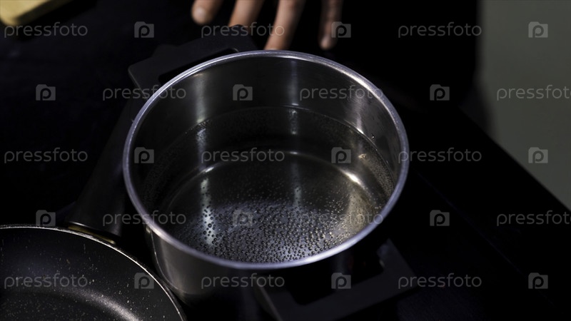 Ближайшее изображение приготовления супа, кипятка воды в нержавеющей кастрюле. арт. Вид сверху прозрачной воды, которая становится теплее внутри горшка на черном фоне поверхности плиты