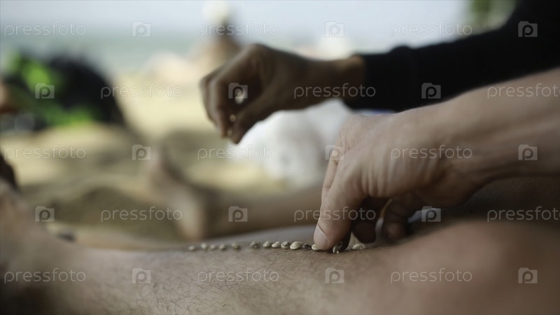 Ноги мужчины на пляже в песок летом каждый кладет зерно песка на ногу другого гея, который отдыхает