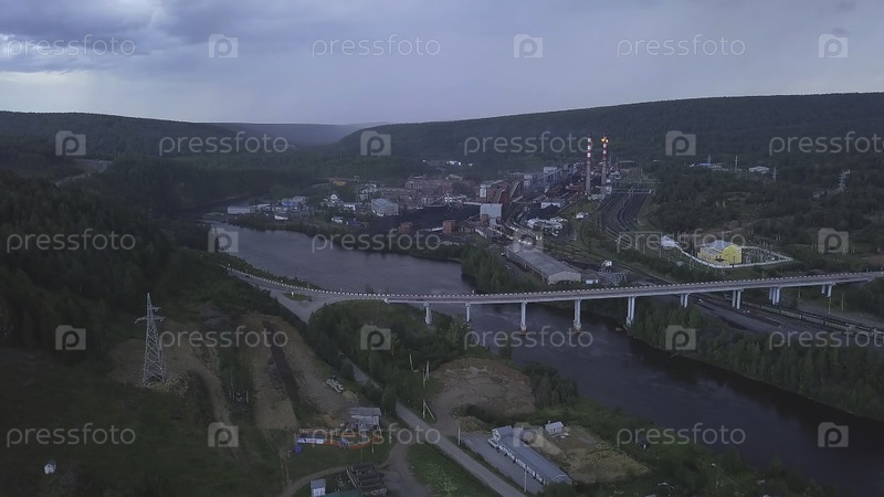 Вид сверху моста через реку в зеленой долине с небольшим городом. Клип. Прекрасный вид на город у реки с мостом летом