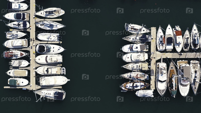 Вид сверху лодок в Просиде, Италия, самой популярной туристической достопримечательности на пляже. Действие. Парковка яхт, яхта и парусная лодка пришвартованы у причала