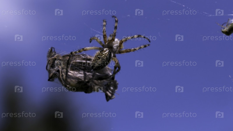 Большой паук с тонкими ногами.Креативность.Насекомое в макрофотографии сортирует большое сухое насекомое на своей паутине в голубом небе.Высокое качество FullHD кадры