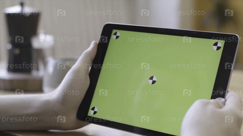 Технология, макет и концепция интернета, chroma key экран для размещения собственного контента. Стоковые кадры. Молодая женщина смотрит на компьютерный планшет с зеленым экраном chroma key