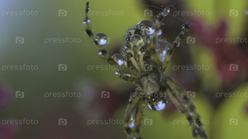 Макровизуальный вид небольшого паука с каплями воды на теле.Креативность.Пауковое насекомое на своей паутине на размытом цветочном фоне