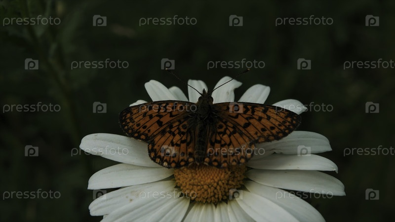 Бабочка собирает нектар из цветка, с близкого расстояния.Креативно.Прекрасная бабочка на желтом бутоне цвета и белые лепестки на зеленом полевом фоне