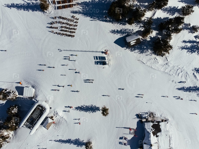 Зимние виды спорта: вид сверху людей, катающихся на лыжах в горнолыжном курорте в Копаонике, Сербия