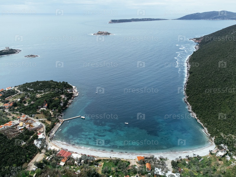 Вид с воздуха прибрежной деревни и бирюзового пляжа в Черногории, окруженный холмами и зелени. c