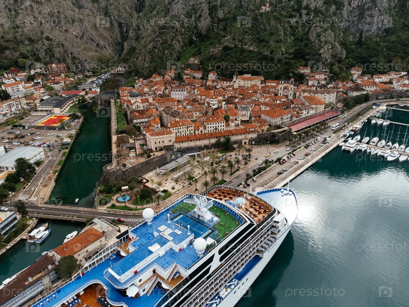 Вид с воздуха круизного лайнера, пришвартованного в городе Котор (Черногория), недалеко от старого города и пристани для яхт, окруженной горами