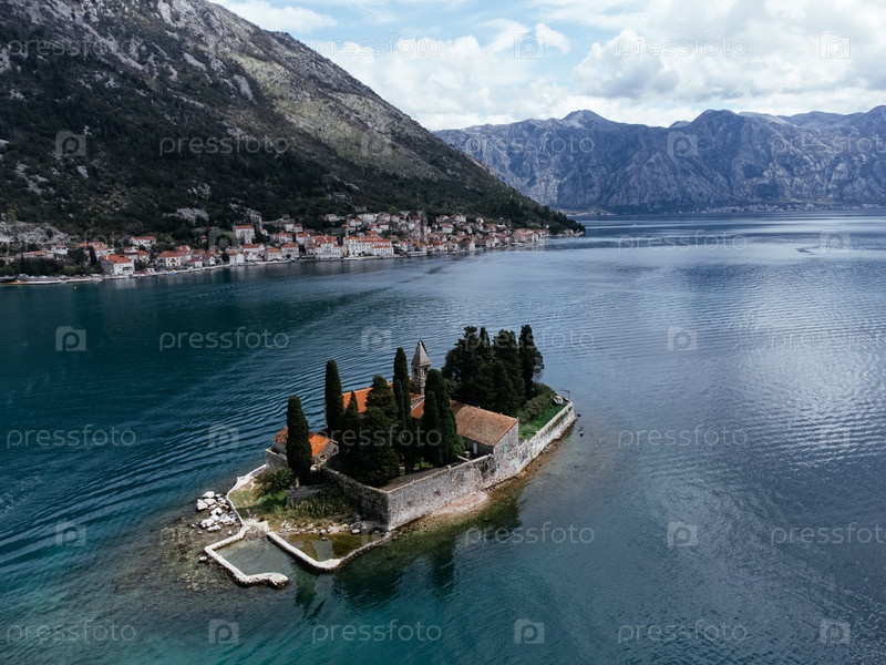 Вид с воздуха острова Святого Георгия недалеко от Пераста в Которском заливе, Черногория, окруженный спокойным морем и горами