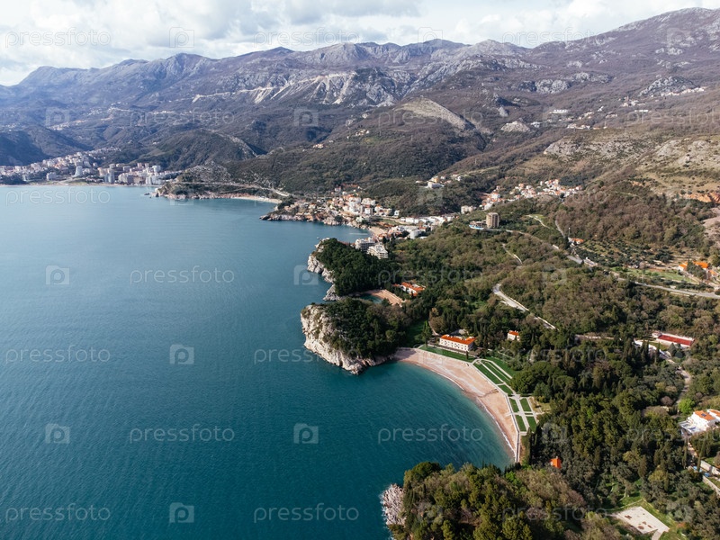 Вид с воздуха островного отеля, соединенного мостом к прибрежной деревне в Черногории на Адриатическом море. c