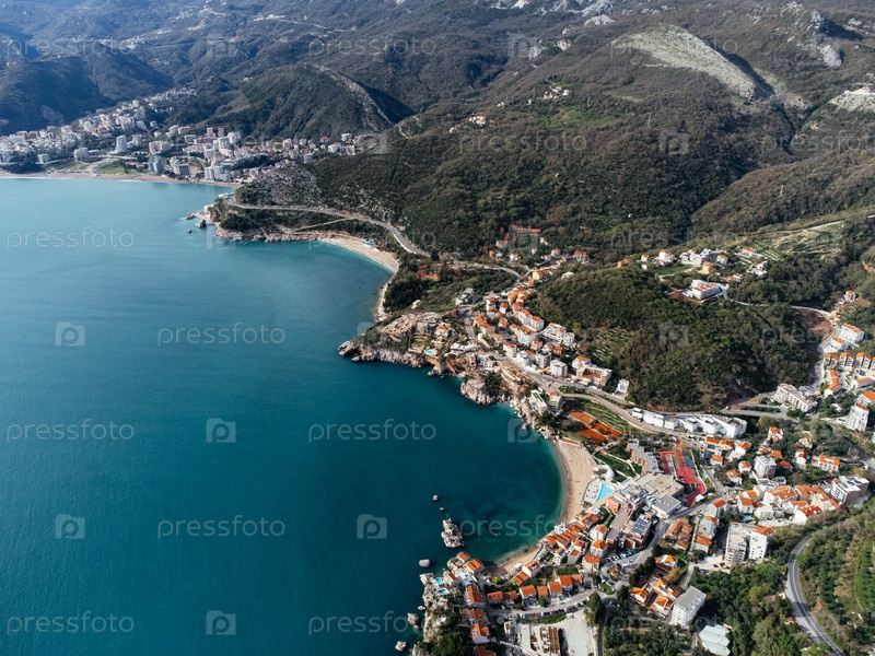 Вид с воздуха островного отеля, соединенного мостом к прибрежной деревне в Черногории на Адриатическом море. c