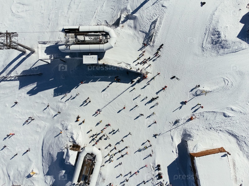 Зимние виды спорта: вид сверху людей, катающихся на лыжах в горнолыжном курорте в Копаонике, Сербия