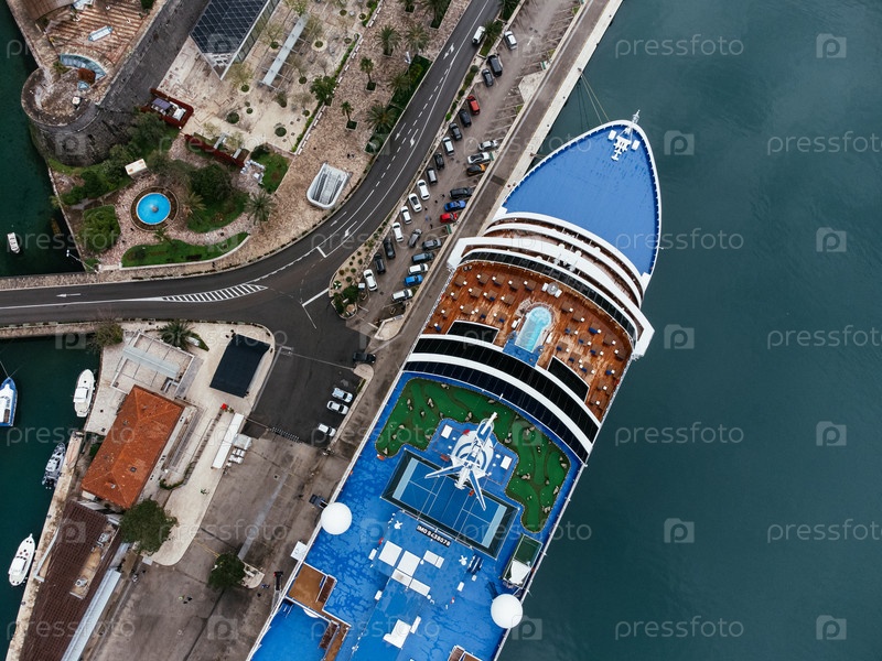 Вид с воздуха круизного лайнера, пришвартованного в городе Котор (Черногория), недалеко от старого города и пристани, окруженной горами