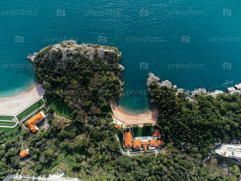 Вид с воздуха островного отеля, соединенного мостом к прибрежной деревне в Черногории на Адриатическом море. c