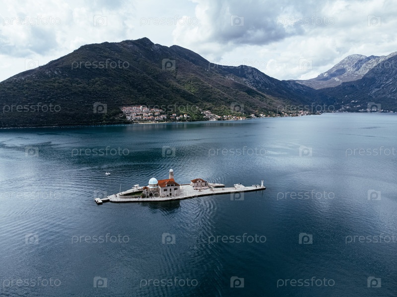 Вид с воздуха острова Святого Георгия недалеко от Пераста в Которском заливе, Черногория, окруженный спокойным морем и горами