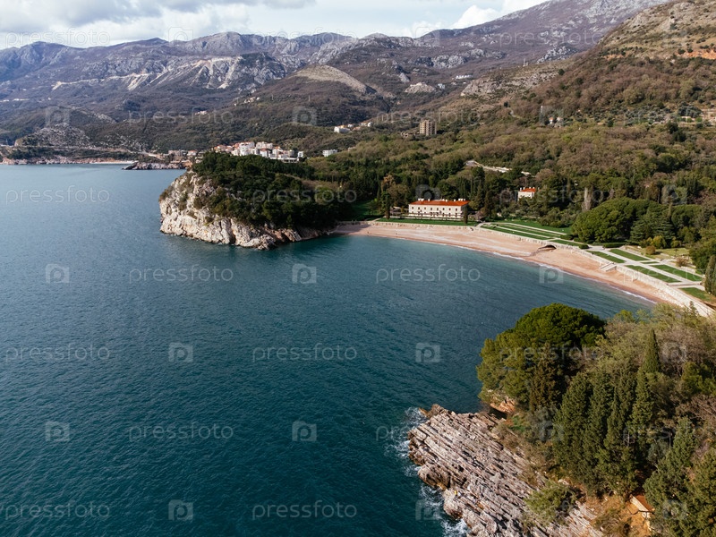 Вид с воздуха островного отеля, соединенного мостом к прибрежной деревне в Черногории на Адриатическом море. c