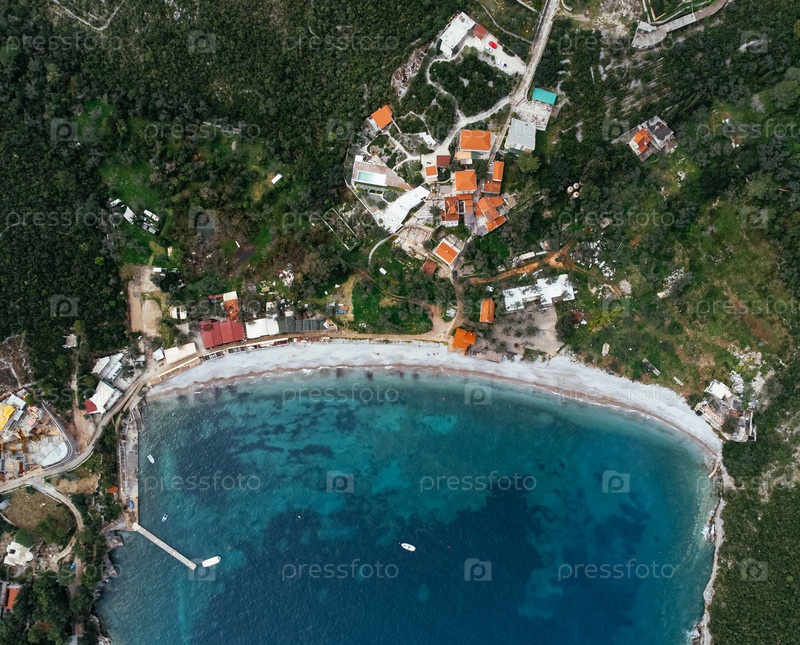 Вид с воздуха прибрежной деревни и бирюзового пляжа в Черногории, окруженный холмами и зелени. c