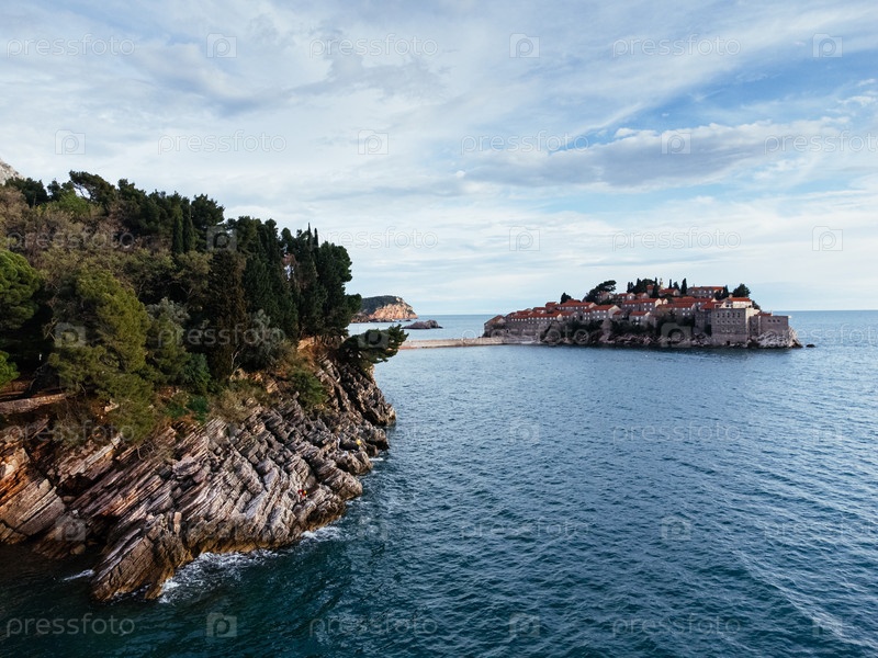 Вид с воздуха островного отеля, соединенного мостом к прибрежной деревне в Черногории на Адриатическом море. c
