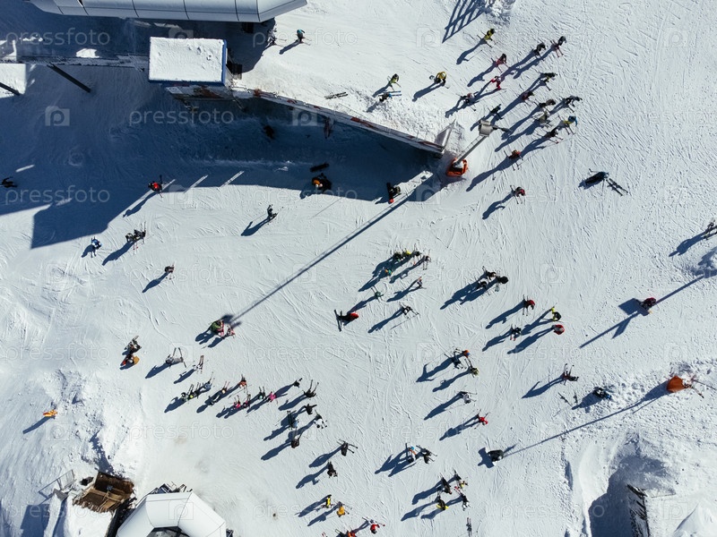 Зимние виды спорта: вид сверху людей, катающихся на лыжах в горнолыжном курорте в Копаонике, Сербия