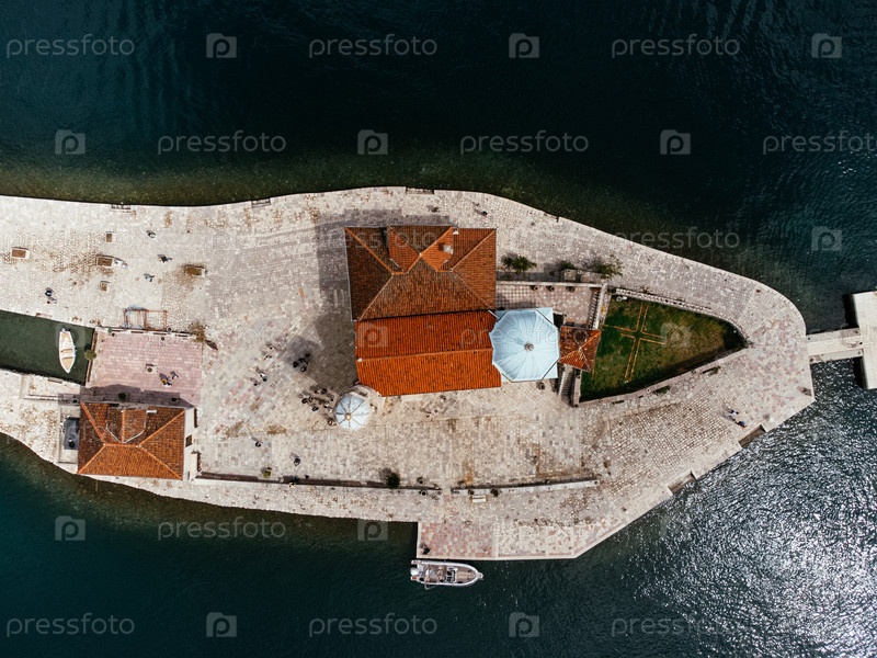 Вид с дронов церкви Богоматери Скала и острова Святого Георгия, Черногория, Европа