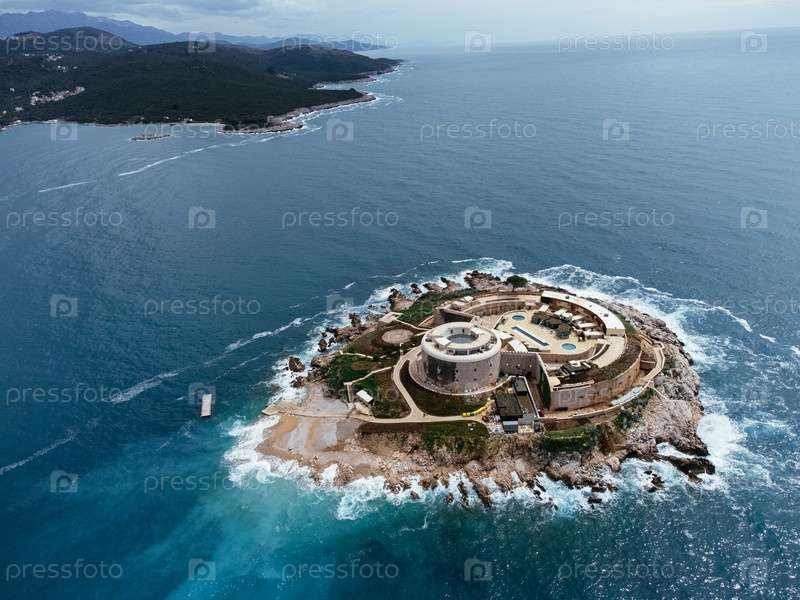 Вид с воздуха исторической прибрежной крепости на островке в Адриатическом море в Черногории, окруженный крутой береговой линией. c