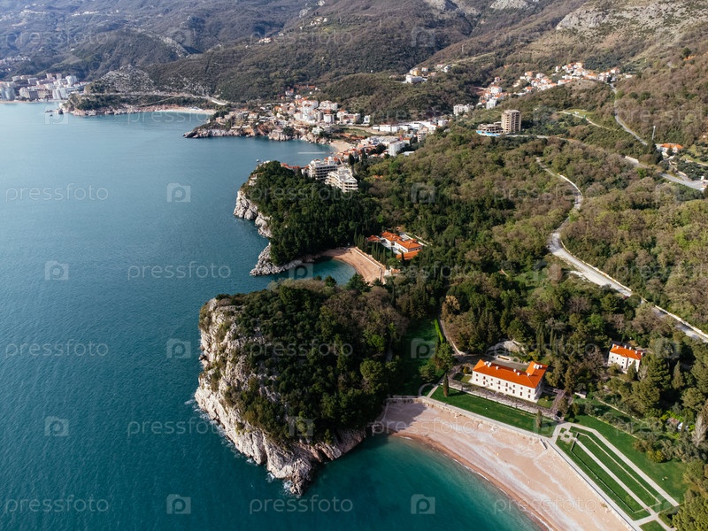 Вид с воздуха островного отеля, соединенного мостом к прибрежной деревне в Черногории на Адриатическом море. c