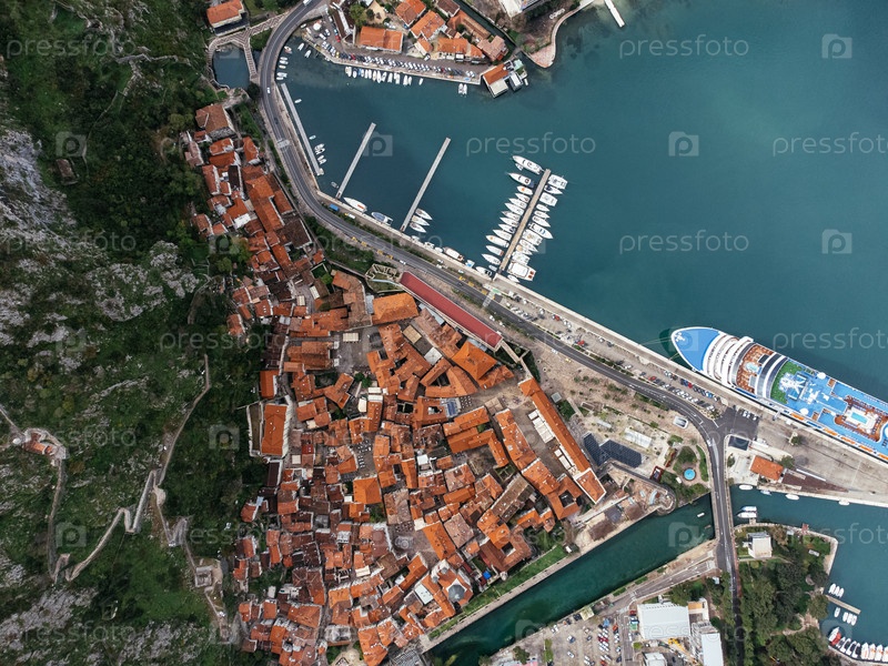 Вид из воздуха на Старый город Котора с оранжевыми крышами и круизным кораблем, пришвартованным в бухте. c