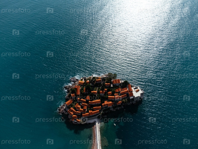 Вид с воздуха островного отеля, соединенного мостом к прибрежной деревне в Черногории на Адриатическом море. c