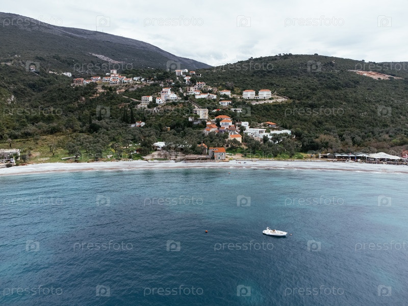 Вид с воздуха прибрежной деревни и бирюзового пляжа в Черногории, окруженный холмами и зелени. c