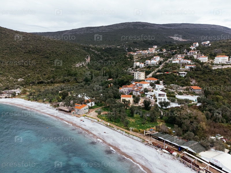 Вид с воздуха прибрежной деревни и бирюзового пляжа в Черногории, окруженный холмами и зелени. c