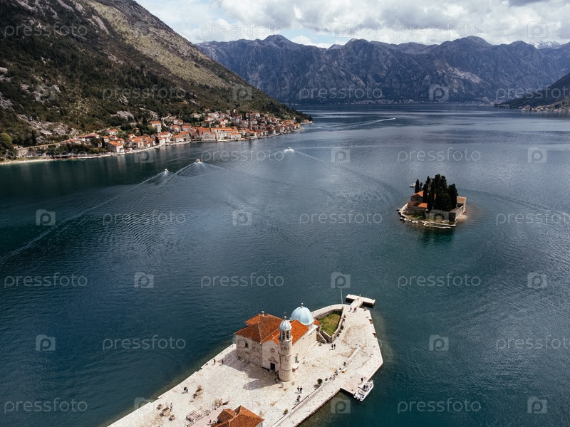 Вид с дронов церкви Богоматери Скала и острова Святого Георгия, Черногория, Европа