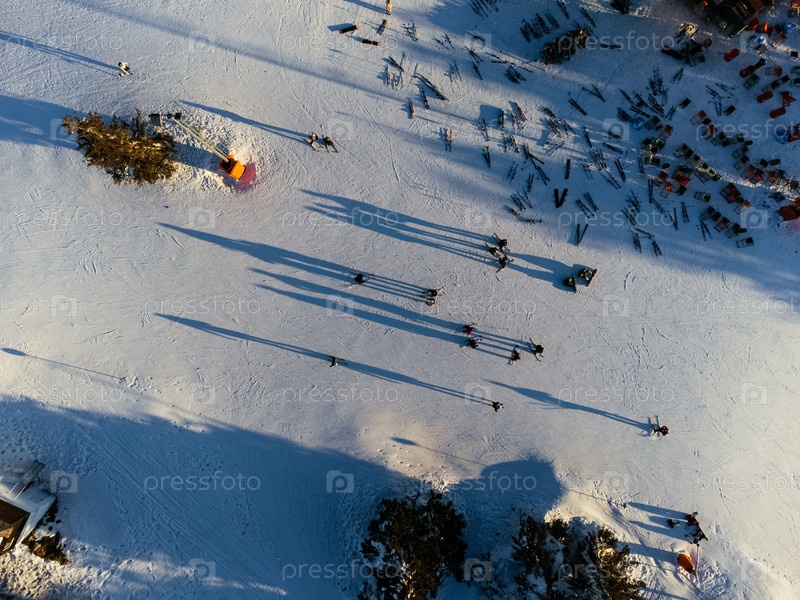 Зимние виды спорта: вид сверху людей, катающихся на лыжах в горнолыжном курорте в Копаонике, Сербия