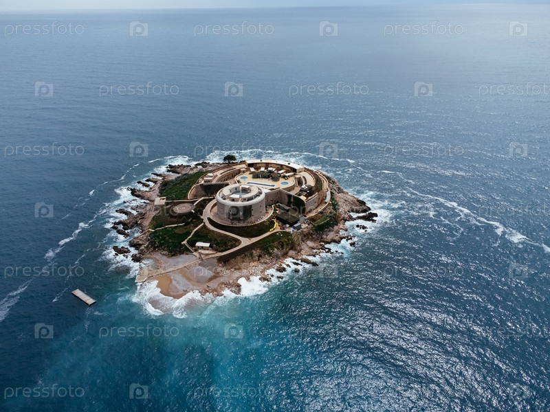 Вид с воздуха исторической прибрежной крепости на островке в Адриатическом море в Черногории, окруженный крутой береговой линией. c