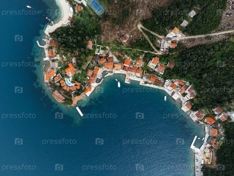 Вид с воздушного дрона города на побережье Адриатического моря.Роза, Черногория, Европа