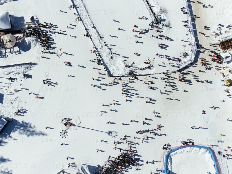 Зимние виды спорта: вид сверху людей, катающихся на лыжах в горнолыжном курорте в Копаонике, Сербия