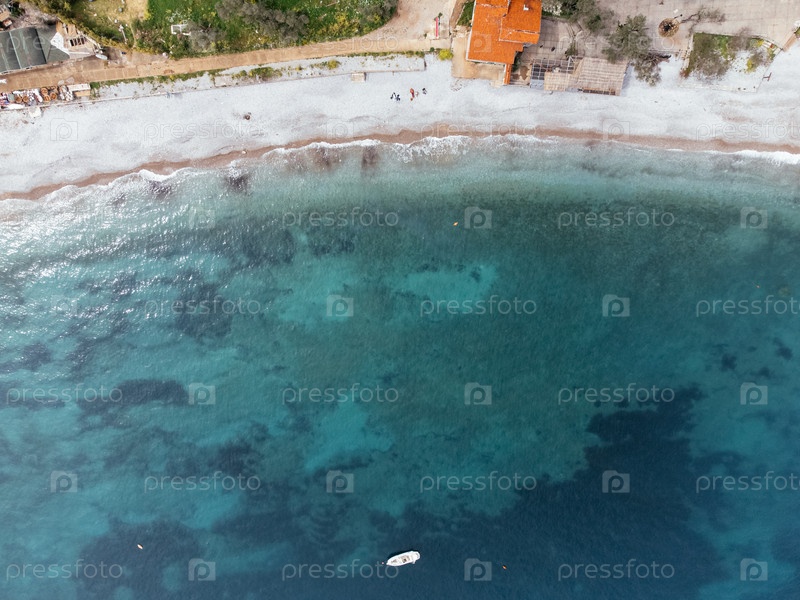 Вид с воздуха прибрежной деревни и бирюзового пляжа в Черногории, окруженный холмами и зелени. c