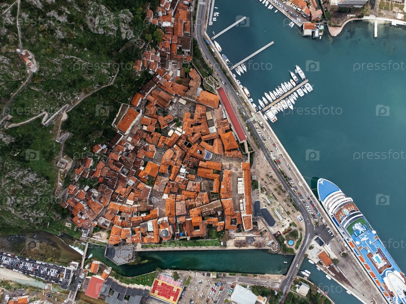 Вид с беспилотника на Которский залив и прибрежный город Котор, Черногория