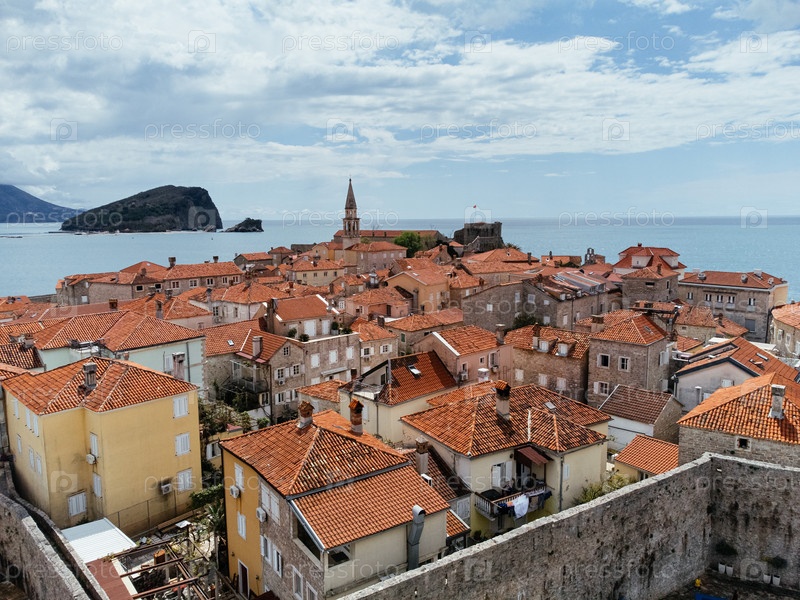 Вид с воздуха на Старый город Будва на Адриатическом побережье, Черногория, с яхтой и крышами из красной черепицы. g